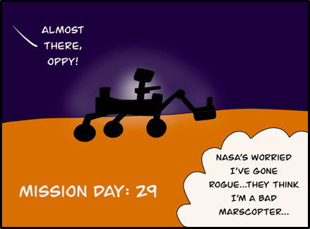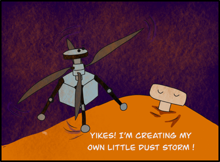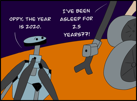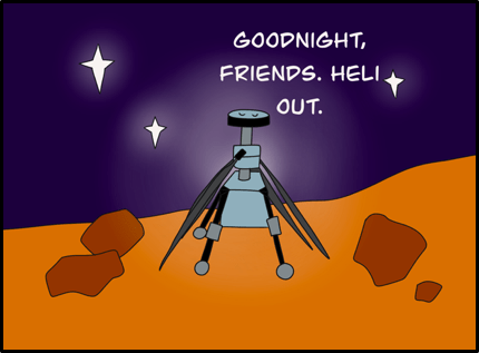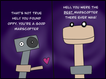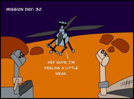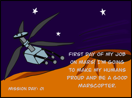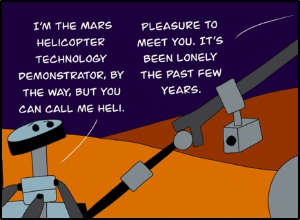 DISCLAIMER: Artistic liberties have been taken with this comic. “Mars 2020” is not the rover’s official name. The MHTD is not meant to travel particularly great distances. The rover and marscopter is scheduled to land on Mars in early 2021.