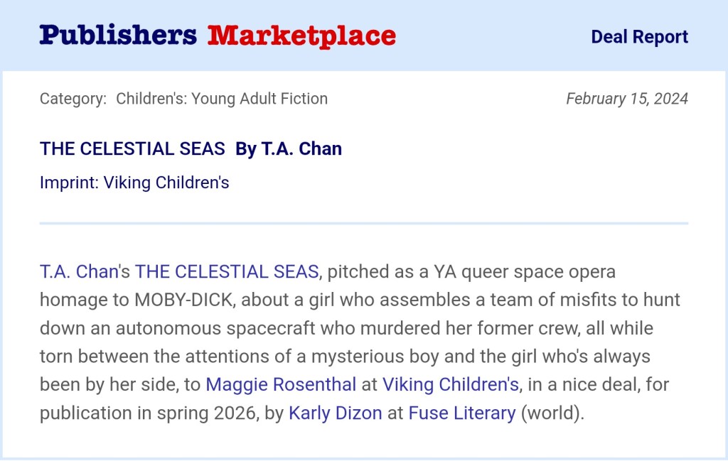 In case you missed it from my social media accounts, the title of this blog post, and the picture above–the whale is out of the tank! I am absolutely thrilled to announce Viking’s Children publisher has acquired The Celestial Seas. I’ve been sitting on this news for some time now and it’s so nice to finally share it with the world!